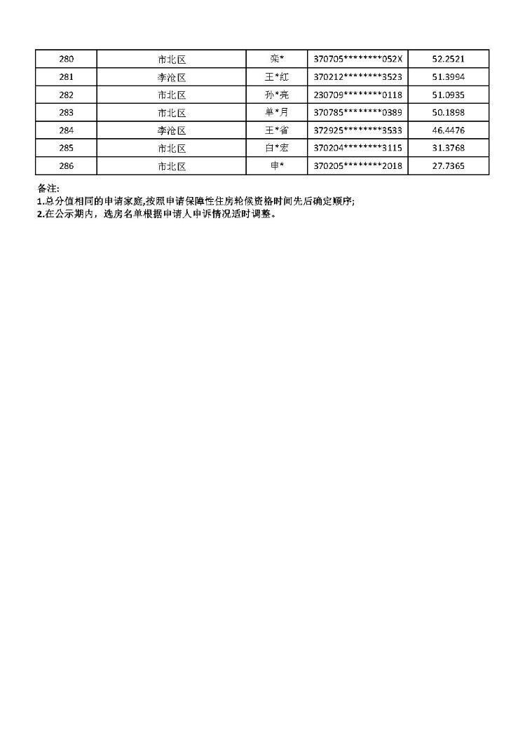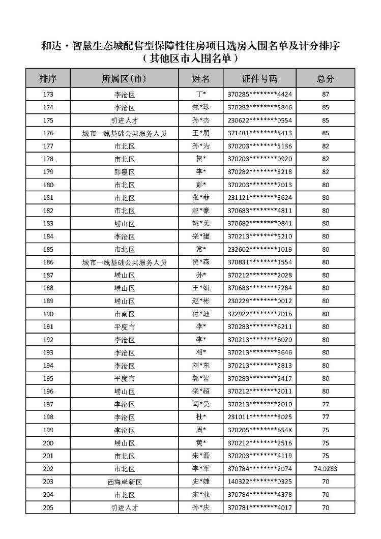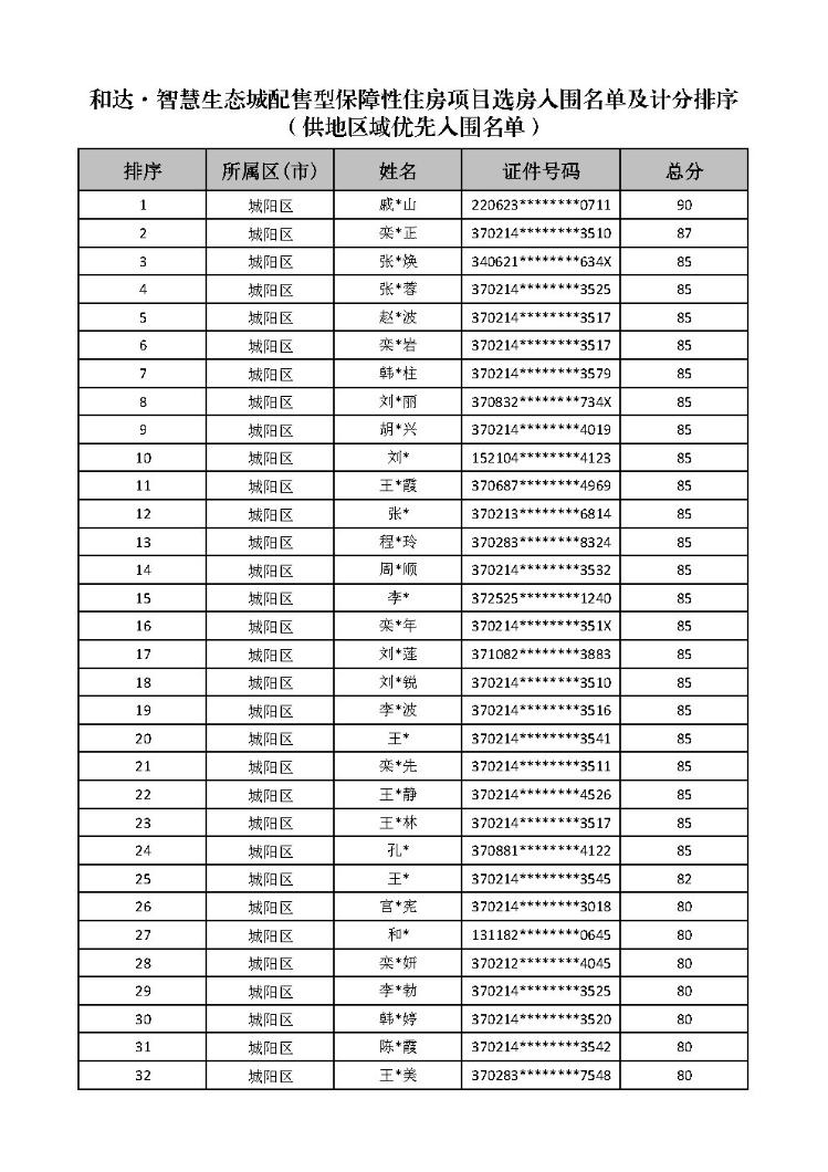 根据《关于和达·智慧生态城配售型保障性住房购买需求征集有关事宜的公告》,申请人已通过“青岛市配售型保障性住房轮候服务系统”完成需求征集和资格审核。经审核,共有286人符合条件入围选房,现将《和达·智慧生态城配售型保障性住房项目选房入围名单及计分排序(选房顺序)》予以公示,公示期为5日。