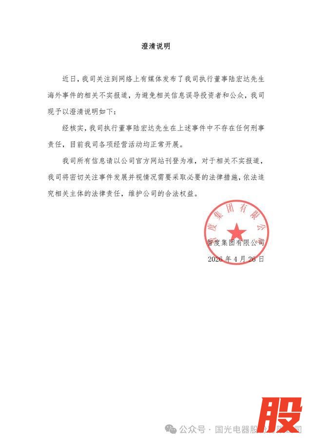 4月26日,国光电器(002045.SZ)、智度股份(000676.SZ)官微发布澄清声明称,关注到网络上有媒体发布了公司执行董事陆宏达海外事件的相关报道。