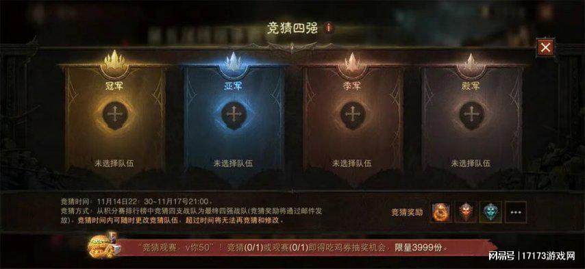 只要参与竞猜或观赛,即可参与KFC“竞猜观赛,V你50”活动,有机会抽中KFC吃鸡券,全服总共限量3999份。