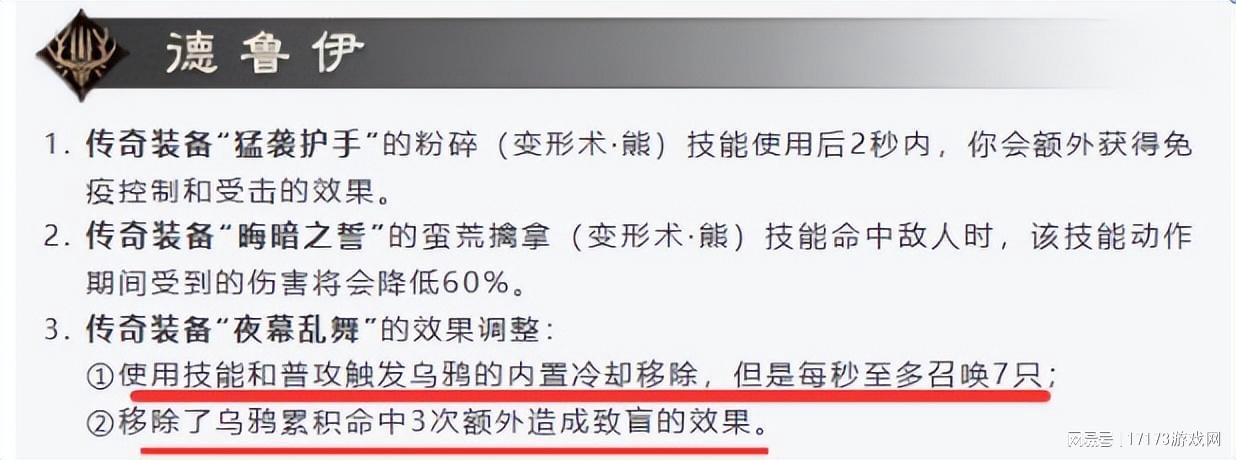 本次体验优化做了一些职业平衡的调整,唯一一个传奇精华做了调整、降低效果的就是德鲁伊的“夜幕乱舞”。